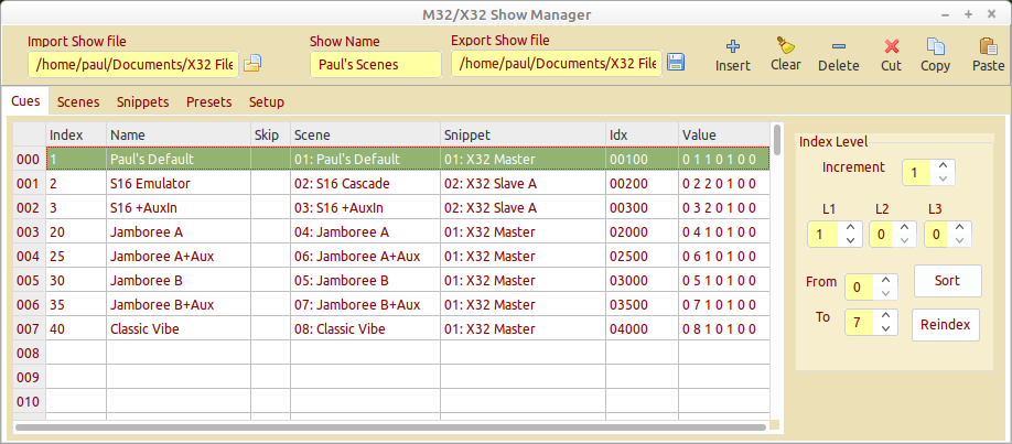 Both the Midas M32 and Behringer X32 share the same design of show management using the console GUI, M32-Edit and X32-Edit apps. This app provides an alternative method to manage these show files (cues, scenes and snippets). It provides an easier method of reorganizing and importing/exporting of files.