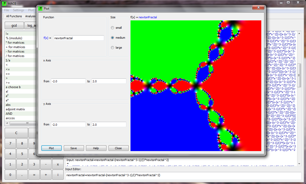 MACE has 230 logical operations, statistical distributions and functions in the fields Analysis, Arithmetic, Complex Functions, Linear Algebra, Differential Calculus, Statistics and Signal Processing.