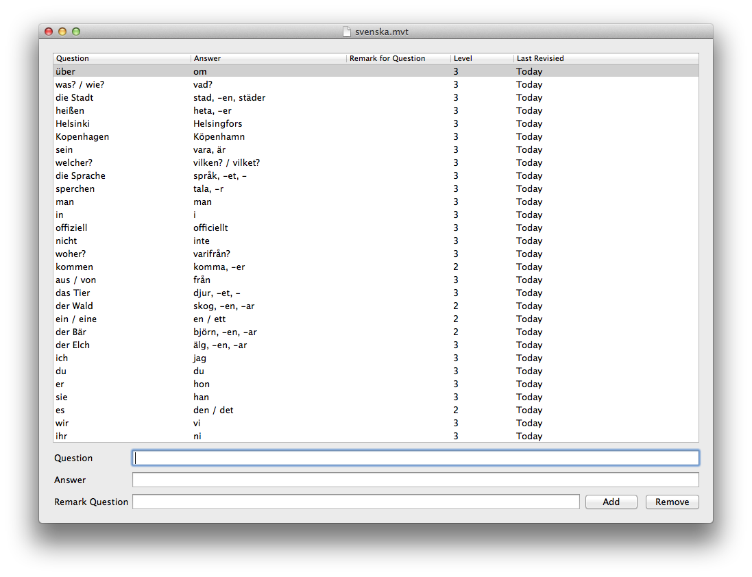 MacVocTrain is a index card based training program for vocabulary. Its on one hand inspired by the program ProVoc (http://www.arizona-software.ch/provoc/) which the author used for learning but which is unfortunately retired. Unlike ProVoc the program uses a very effective learning methode described Sebastian Leitner in his book "How to Learn to Learn" from 1973, see http://en.wikipedia.org/wiki/Leitner_system .