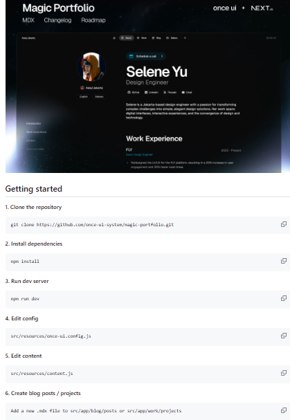 Magic Portfolio is a Next.js-based portfolio template built on the Once UI design system, designed to give developers and creatives a clean, timeless way to showcase their work. It provides a minimal, beginner-friendly setup that focuses on strong typography, responsive layouts, and restrained motion instead of heavy animations. Content is managed through a structured configuration and MDX-based content system, so you can define sections, projects, blog posts, gallery items, and about/CV information in code-backed content files. The template emphasizes SEO with auto-generated Open Graph/X images, schemas, and metadata derived from the content configuration, making it more discoverable out of the box. It offers flexible feature toggles to enable or disable sections such as blog, work, gallery, and about, as well as options for automatic social link generation and password-protected URLs.