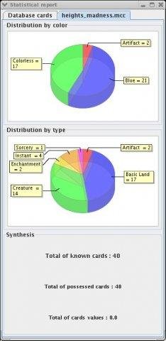 This tool has two parts : a collection manager and an online duel virtual battleground for the card game "Magic : The Gathering", written in Java (Java 5, JFreeChart and XStream are needed). You can import cards using the official online card database.