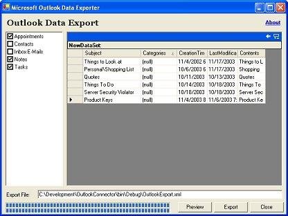 Export Microsoft Outlook data using the Outlook COM Object Library and Microsoft .NET XML DataSets in C#.