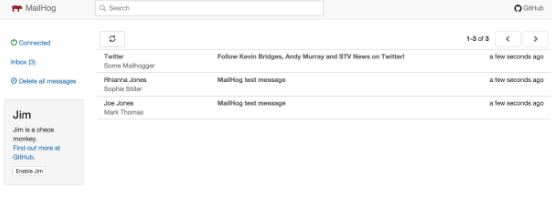Inspired by MailCatcher, easier to install. Built with Go, MailHog runs without installation on multiple platforms. Run it from Docker Hub or using the provided Dockerfile. The SMTP server starts on port 1025, the HTTP server starts on port 8025, in-memory message storage. ESMTP server implementing RFC5321. Support for SMTP AUTH (RFC4954) and PIPELINING (RFC2920). Web interface to view messages (plain text, HTML or source). Supports RFC2047 encoded headers. Real-time updates using EventSource. Release messages to real SMTP servers. Chaos Monkey for failure testing. HTTP API to list, retrieve and delete messages. See APIv1 and APIv2 documentation for more information. HTTP basic authentication for MailHog UI and API. Multipart MIME support. Download individual MIME parts. In-memory message storage. MongoDB and file based storage for message persistence. Lightweight and portable. No installation required.