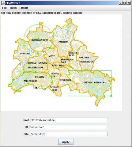 JAVA tool for creating html image maps. It's possible to load a picture and create rectangles, circles and polygons. Additionally, content for href, alt and title can be set.
