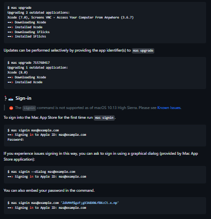 Mac App Store command line interface. mas-cli is a simple command line interface for the Mac App Store. Designed for scripting and automation. mas requires Swift 5 runtime support. macOS 10.14.4 and later include it, but earlier releases did not. Each application in the Mac App Store has a product identifier which is also used for mas-cli commands. Using mas list will show all installed applications and their product identifiers. It is possible to search for applications by name using mas search which will search the Mac App Store and return matching identifiers. Include the --price flag to include prices in the result. mas is integrated with homebrew-bundle. If mas is installed, and you run brew bundle dump, then your Mac App Store apps will be included in the Brewfile created. See the homebrew-bundle docs for more details. mas operates via the same system services as the Mac App Store.