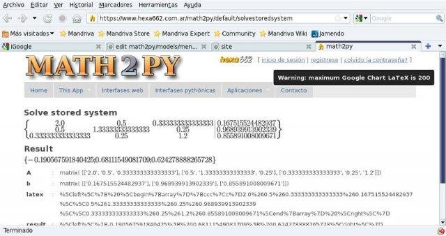 Web interface for python math modules. Developed with web2py. It uses pure python modules for easy deployment . Math2py requires the mpmath library installed with web2py. Download and unzip mpmath in web2py/site-packages