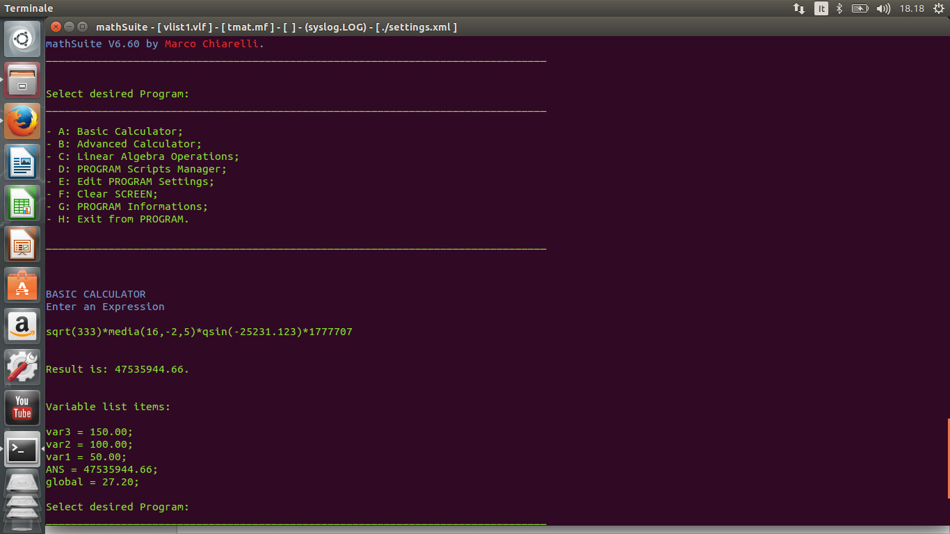(ITA) MathSuite è una potente suite di calcolo completa scritta interamente in C che permette principalmente di effettuare complessi calcoli e manipolare i valori tramite variabili e di tenere traccia delle operazioni tramite dei logs. Racchiunde un set di funzioni tali da coprire calcoli trigonometrici, statistici, euristici, geometrici, algebrici e tanto altro... Particolare sforzo alla realizzazione del programma è stato concentrato sul sistema di Gestione delle Matrici. Le Matrici sono gli elementi principali per questo programma, di conseguenza numerose operazioni di Algebra Lineare sono state dedicate a questo tipo fondamentale. Si va ad esempio dalla Fattorizzazione LU, Decomposizione in Valori Singolari (SVD), Prodotto e Somma tra Matrici al Calcolo del Determinante, del Rango, controllo Indice di Condizionamento etc. Non mancano delle chicche a carattere generale, come operazioni tra numeri complessi, risolutore di Sistemi Lineari, Integratore di Funzioni pre-caricate. Inoltre, il programma accetta senza problemi in ingresso (nella Riga di Comando) dei comandi, che a loro volta accettano determinati parametri. Questa feature permette l'esecuzione in sequenza di più comandi del programma, configurandosi come un vero e proprio linguaggio di scripting, se utilizzato nella maniera giusta. Non la solita calcolatrice di Windows, dunque..