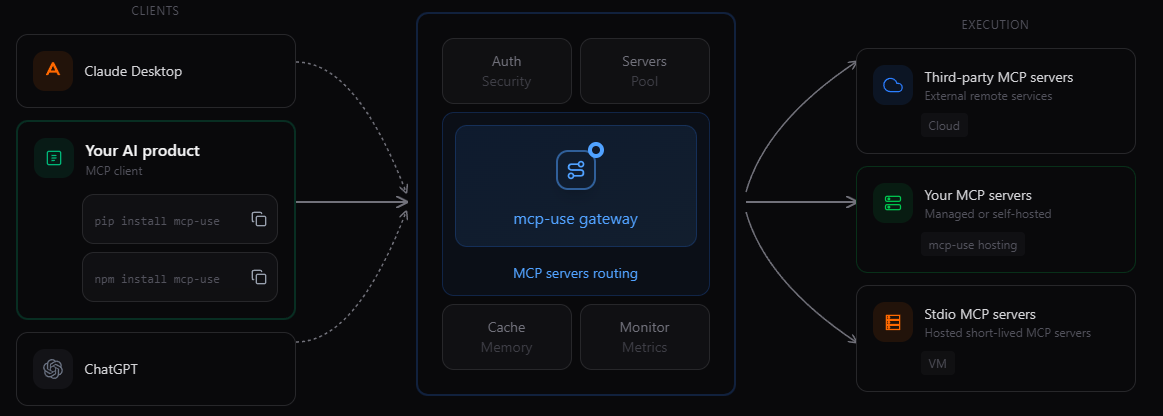 mcp-use is an open source development platform offering SDKs, cloud infrastructure, and a developer-friendly control plane for building, managing, and deploying AI agents that leverage the Model Context Protocol (MCP). It enables connection to multiple MCP servers, each exposing specific tool capabilities like browsing, file operations, or specialized integrations, through a unified MCPClient. Developers can create custom agents (via MCPAgent) that dynamically select the most appropriate server for each task using configurable pipelines or a built-in server manager. It simplifies authentication, access control, audit logging, observability, sandboxed runtime environments, and deployment workflows, whether self-hosted or managed, making MCP development production-ready. With integrations for popular frameworks like LangChain (Python) and LangChain.js (TypeScript), mcp-use accelerates the creation of tool-enabled AI agents.