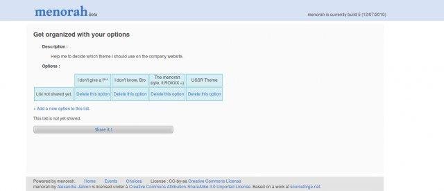 Menorah is a small CC-BY-SA licensed piece of php-based software. It allows the owners of a server or a website to create schedules and lists for the people they work or share stuffs with, in order for them to answer and give their opinion.