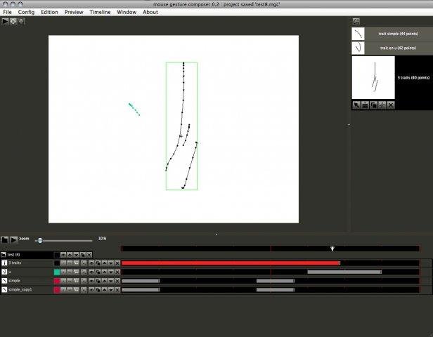 MouseGestureComposer is a graphical partition editor for visual artists and musicians. Basic elements are mouse movements, placed on a timeline segmented in measures, similar to classical music. Uses processing.org. Developed by numediart.org. A video tutorial is available here: http://vimeo.com/33442844
