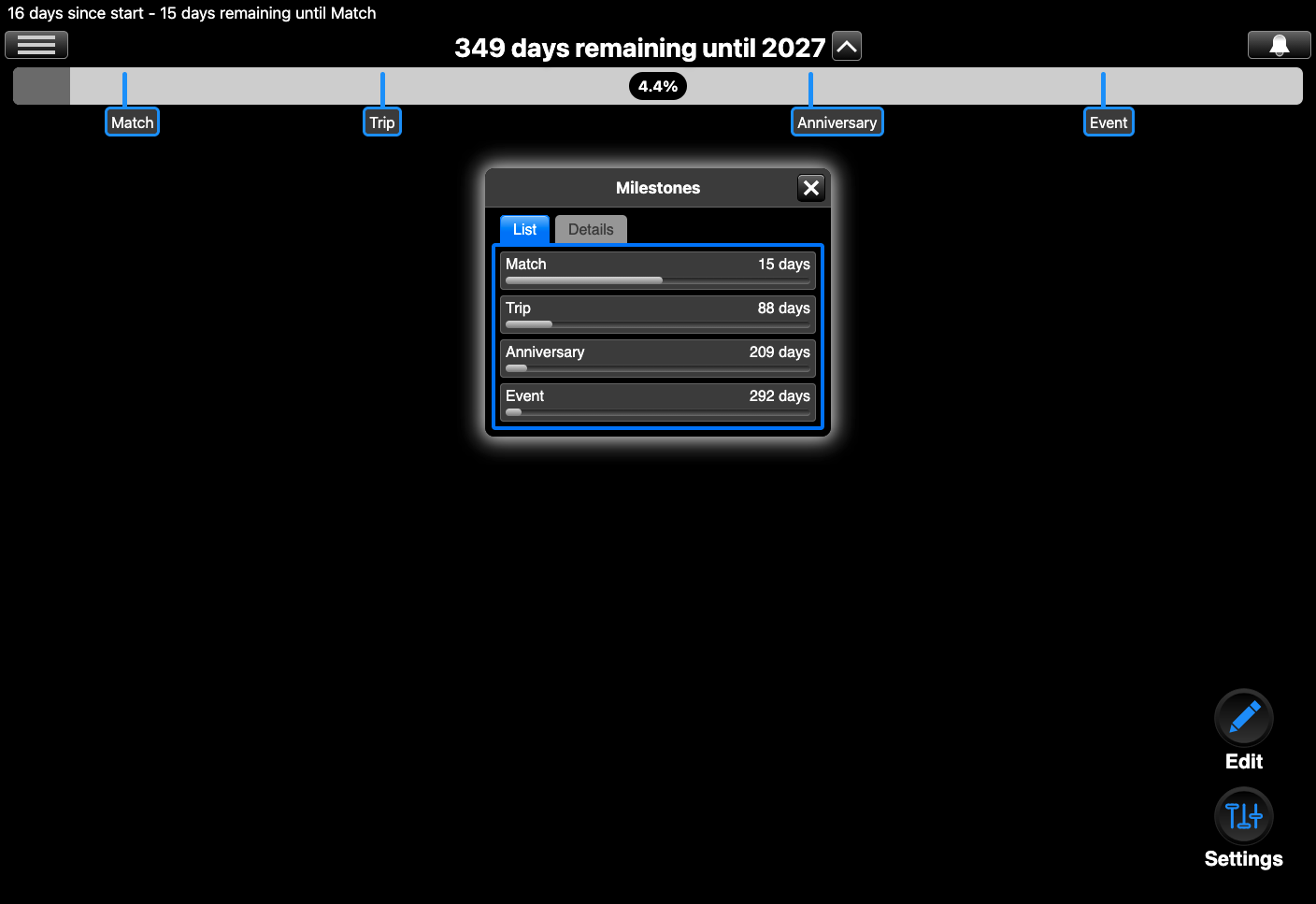 - Milestone progress bars: Click on the countdown text to see individual progress bars for each milestone