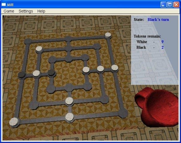 Mill 3D is a nine men 's morris game. You can play against the computer, or a human player, in a nice 3D enviroment. Mill 3D uses Fltk for the GUI, OpenGL for rendering and SDL for many other things. It is available for Linux, and Windows.