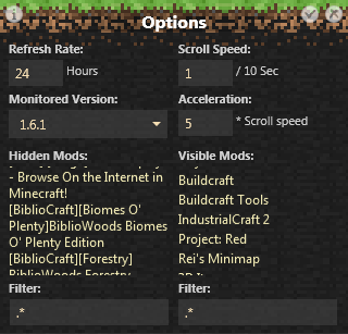 Monitors the mods on MCF Modslist http://modlist.mcf.li/ and on MineCraftWiki http://minecraft.gamepedia.com/Mods (old - http://www.minecraftwiki.net/wiki/Mods) and shows the status of them.
