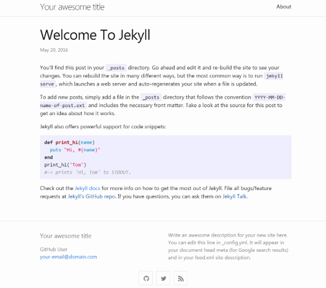 It's Jekyll's default (and first) theme. It's what you get when you run jekyll new. Minima has been scaffolded by the jekyll new-theme command and therefore has all the necessary files and directories to have a new Jekyll site up and running with zero-configuration. From Minima v3 onwards, the base layout is named base.html instead of default.html to avoid confusing new users into assuming that name holds a special status. Users migrating from older versions with customized _layouts/default.html are advised to rename their copy to _layouts/base.html. Migrating users with additional customized layouts may either update front matter references to the former default.html layout or create a new default.html layout referencing the current base.html, whichever route is the easiest.