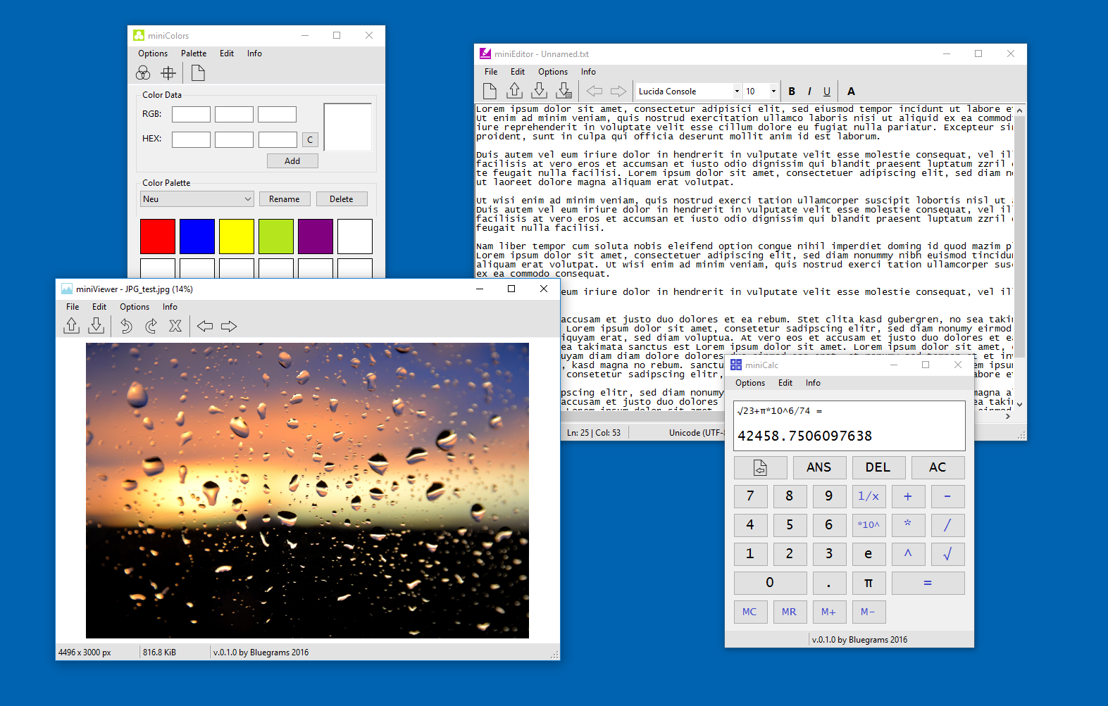 miniWork is a project which includes a group of small and simple VB.Net WinForms office applications. It consists of the text and rich text editor miniEditor, the simple calculator miniCalc, the color picker miniColors and the image viewing program miniViewer. All applications are independent programs which are put together in this project. The project is kept very simple, so all applications only provide the most basic functions.