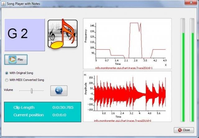 - Play back the MIDI file created together with notes displaying, frequency and amplitude variation graphs.