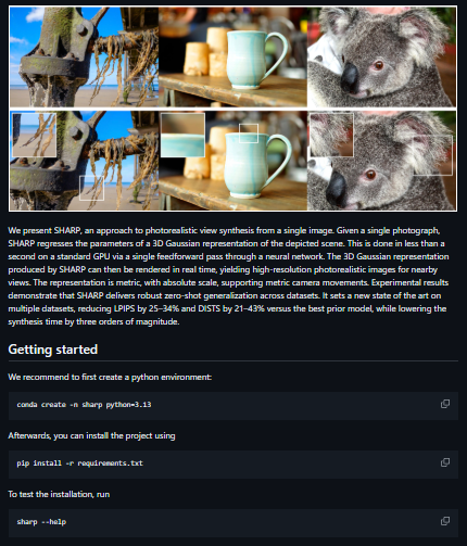 ML Sharp is a research code release that turns a single 2D photograph into a photorealistic 3D representation that can be rendered from nearby viewpoints. Instead of requiring multi-view input, it predicts the parameters of a 3D Gaussian scene representation directly from one image using a single forward pass through a neural network. The core idea is speed: the 3D representation is produced in under a second on a standard GPU, and then the resulting scene can be rendered in real time to generate new views interactively. The representation is metric, meaning it supports camera movements with an absolute scale rather than only relative depth cues, which is useful for consistent viewpoint changes and downstream spatial tasks. The project is structured for reproducibility, with code and assets aimed at demonstrating view synthesis quality, sharp details, and fine structures when rendering high-resolution images.