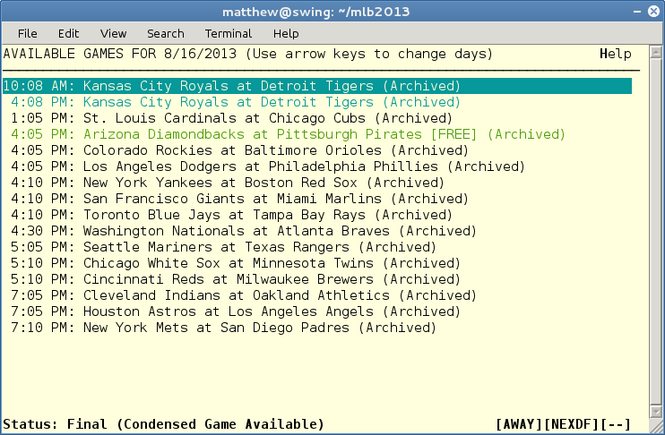 I love being able to watch Dodger games without my browser! It took me some doing to get PyXML installed and I can't seem to get mlbhls working, but watching Dodger games online, even form the night before, without firing up my web browser? Priceless. I'm going to hate when my two week free trial of MLB.TV expires because I'm already getting spoiled.