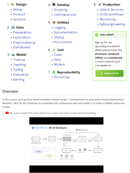 The MLOps Course by Goku Mohandas is an open-source curriculum that teaches how to combine machine learning with solid software engineering to build production-grade ML applications. It is structured around the full lifecycle: data pipelines, modeling, experiment tracking, deployment, testing, monitoring, and iteration. The repository itself contains configuration, code examples, and links to accompanying lessons hosted on the Made With ML site, which provide detailed narrative explanations and diagrams. Instead of focusing only on model training, the course emphasizes best practices like modular code design, CI/CD, containerization, reproducibility, and responsible ML (including monitoring and feedback loops). This makes it particularly valuable for engineers transitioning from “notebooks and prototypes” to real systems that must be robust, maintainable, and observable in production.