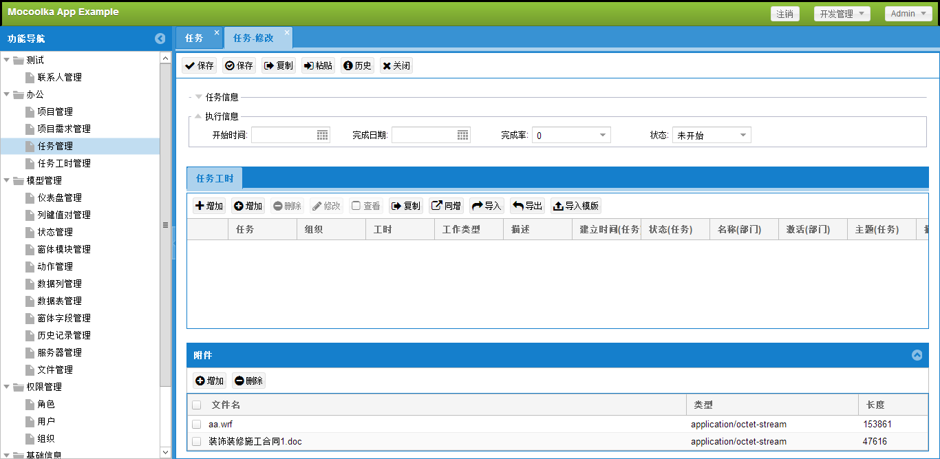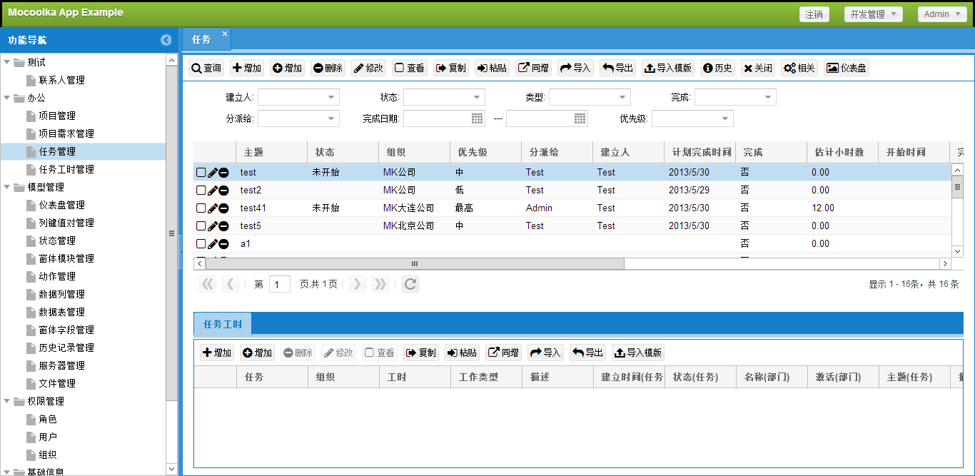 - 每个模块都可以使用基础功能(导入、导出、历史、任务、图表等)
