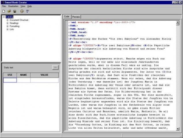 Utility to help create book modules for the Sword Project. Easy Module properties editing. Uses syntax highlighting for the text code. Supports ThML, Osis and plain text at present. Easy one-click creation of Sword Module. Includes Spell-checker. Each pr