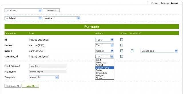 MOLE = Make Our Life Easy, php code generator for mysql web based applications. Plugin support(listgen,formgen), customizable templates, simple code no class, neat interface.(Similar to phpcodeGenie but much more advanced)