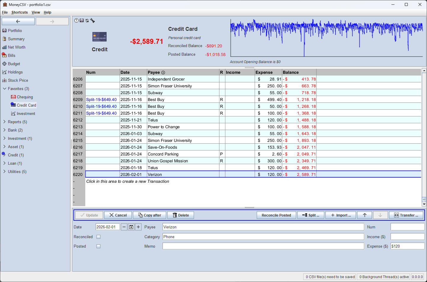 This personal finance program allows you track all personal accounts including investment accounts. Money CSV provides reoccurring bills, budget tracking, report generation, net worth tracking and custom transaction import rules. The program supports importing of downloaded transaction files (OFX, QFX and QIF). Money CSV supports stock price updates if you get a key for the Yahoo Finance (YH Finance) API from RapidAPI.com. The intro level API key is free, and you get 500 downloads per month of all your stocks, which is plenty of downloads as one typically just updates once a day. The main advantage of this Money CSV is that all account transactions are stored in CSV text files rather than a hidden database format. This means that your financial data is always stored locally (or on your own cloud) and your financial data is always accessible as the data is stored in human readable text files.
