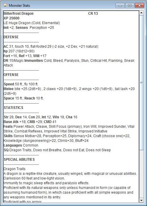 Monster Generator creates D&D monsters of CR 1-50 for use with the Pathfinder ruleset. The monsters can be individually customized and simply use the program to calculate stats and save time, or a completely or partially random monster can be generated with the press of a button.