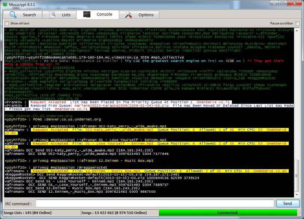 IRC client optimized for downloading mp3 music, videos, images and more. Easy to install with a startup wizard and an intuitive user interface with many customizable options.