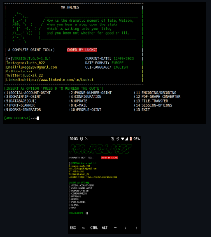 Mr.Holmes is a project focused on information gathering by public sources about social networks,phone-numbers, domains and ip and with the help of Google-Dorks it generated some useful links for information gathering. It can geolocate any ip or domain and geolocate approximately every location of almost all the companies. Including Who-is Lookup, Phone-Carriers and Proxied Requests.