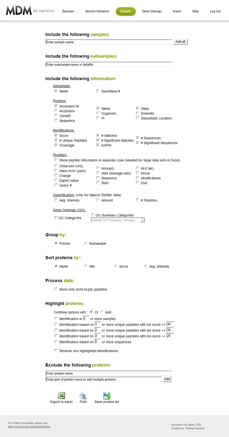 Data processing and analysis in proteomic studies is a significant challenge and very time consuming. MS Data Miner (MDM) is a freely available web-based software to analyze, process, validate, compare, and display output files from MS software, including Mascot (Matrix Science), Mascot Distiller (Matrix Science) and ProteinPilot (AB Sciex). It was developed to significantly decrease the data analysis time and to handle large proteomic studies.