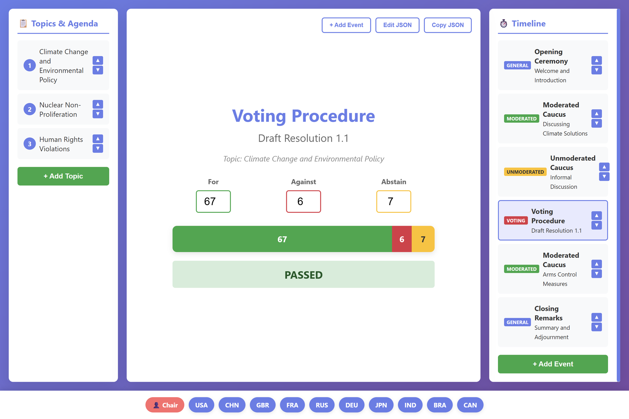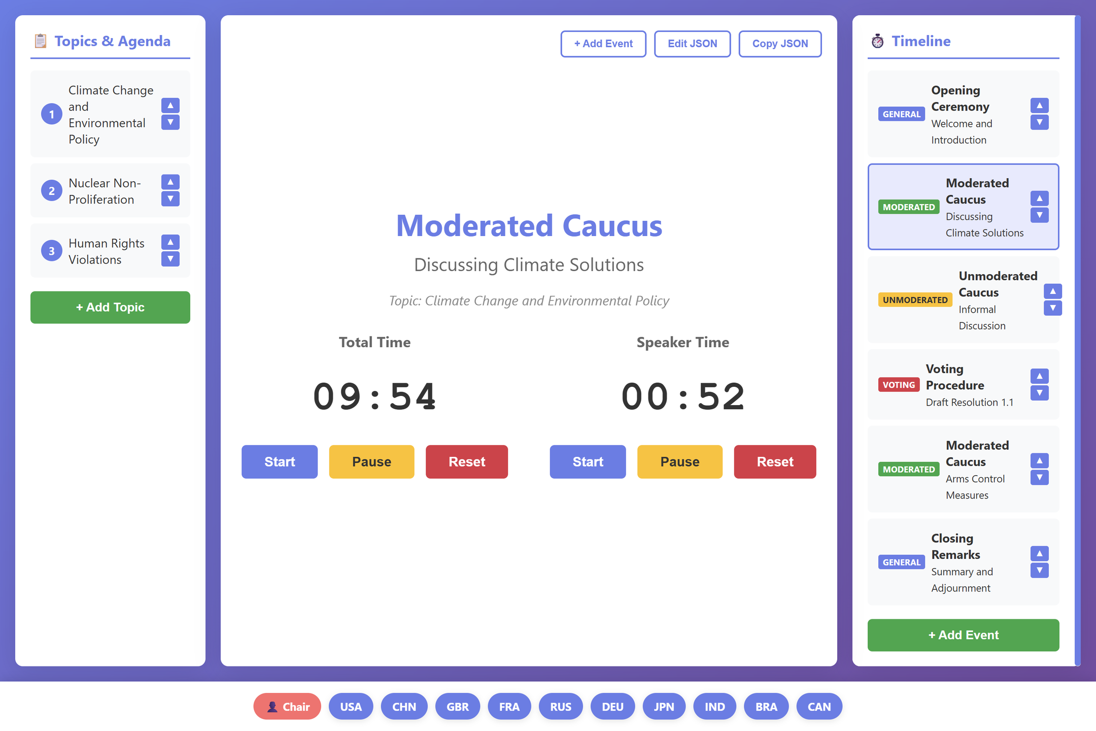- GUI panel to add moderated/unmoderated caucuses, votes, and more