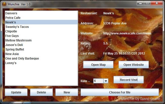 Munchie is a fun little jar program (so java required) that can help you and your coworkers (or friends) make the important decisions in life. Where to eat for lunch.