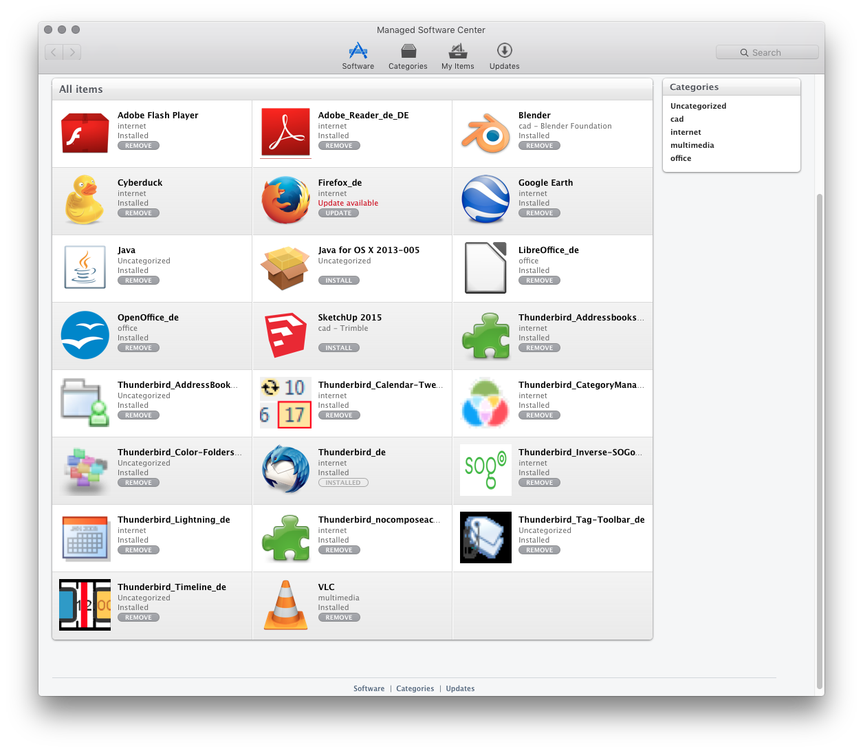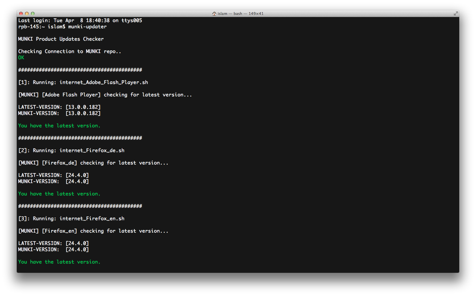 This MUNKI SERVER Command line Tool (Munki Updater) will check for available MUNKI Product Updates on official Servers (example Mozilla) and will allow to Download and Update older Product Versions on MUNKI Repository and distribute them on clients having older versions.