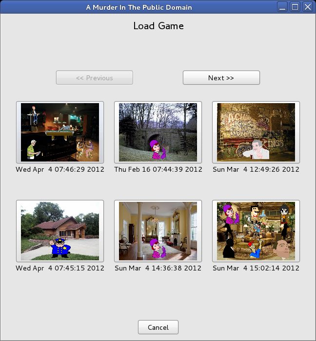 A Murder In The Public Domain is a murder mystery game built from public domain movies, sounds, pictures, and images. A Windows install exe, an rpm, and a deb are also available. For details, please see: http://murderpd.sourceforge.net/
