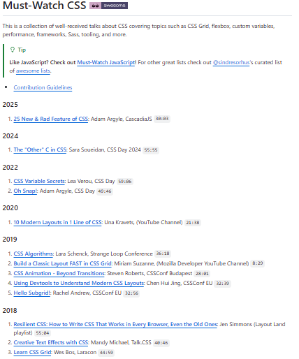 Must-Watch CSS is a curated collection of high-quality recorded talks and presentations about CSS, covering both foundational topics (like layout, Flexbox, Grid) and more advanced or modern concerns (such as performance, tooling, CSS variables, animations, and architecture). Rather than being a code library, it serves as a learning resource — a “watch-list” for front-end or UI developers who want to deepen their understanding of CSS beyond basic syntax. The repository organizes talks by year and topic, giving a historical and topical overview of how CSS practices and tools have evolved. For learners, this collection allows seeing how experts think about layout, performance, design trade-offs, and how CSS-related problems are solved in real projects or at scale. It’s especially useful if you prefer video learning over documentation, or if you want to expose a team (or yourself) to a variety of perspectives and opinions about styling, architecture, and CSS best-practices.