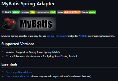 MyBatis-Spring adapter is an easy-to-use Spring Framework bridge for MyBatis sql mapping framework. MyBatis-Spring integrates MyBatis seamlessly with Spring. This library allows MyBatis to participate in Spring transactions, takes care of building MyBatis mappers and SqlSessions and inject them into other beans, translates MyBatis exceptions into Spring DataAccessExceptions, and finally, it lets you build your application code free of dependencies on MyBatis, Spring or MyBatis-Spring. Spring version 2 only supports iBATIS version 2. An attempt was made to add MyBatis 3 support into Spring 3 (see the Spring Jira issue. Unfortunately, Spring 3 development ended before MyBatis 3 was officially released. Because the Spring team did not want to release with code based on a non-released version of MyBatis, official Spring support would have to wait.