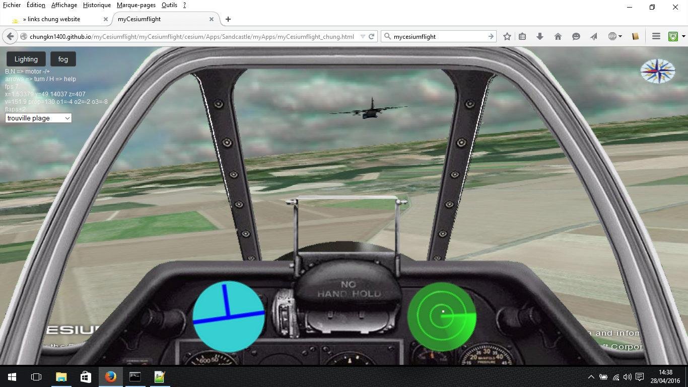 myCesiumflight chung is a small Cesium engine based 3D webgl flight simulator written in html5, css and javascript . Fly anywhere in the world with photorealistic high resolution terrain imagery and elevation heightmaps . Uses cssscale to increase fps rate. (12 fps fullscreen on my notebook) standalone webgl and localhost modes available . Fetchs openstreetmap infos to display airports on radar and generate airports radio messages .Also osm bridges and buildings save and reload on startup .