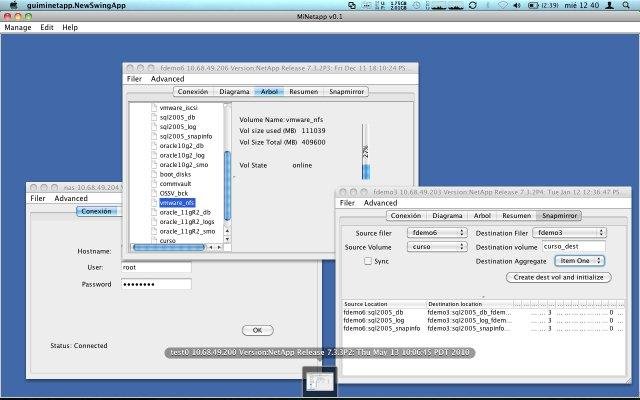 Software to manage Netapp filers and vfilers like System Manager but written in java. Right now it only connects to filers using Netapp API, displays aggregates and volume information, and can stablish Snapmirror relationships.