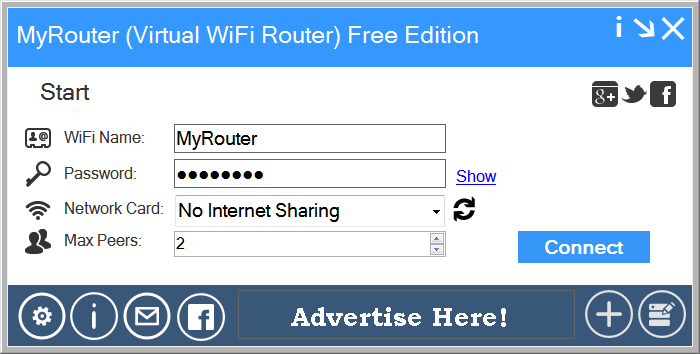 MyRouter is a Virtual WiFi Router that takes advantage of the WindowsXP , Windows 7 and Windows 2008 R2 Virtual WiFi technology and simplifies the process of sharing your internet securely with other WiFi enabled device's with a few clicks.
