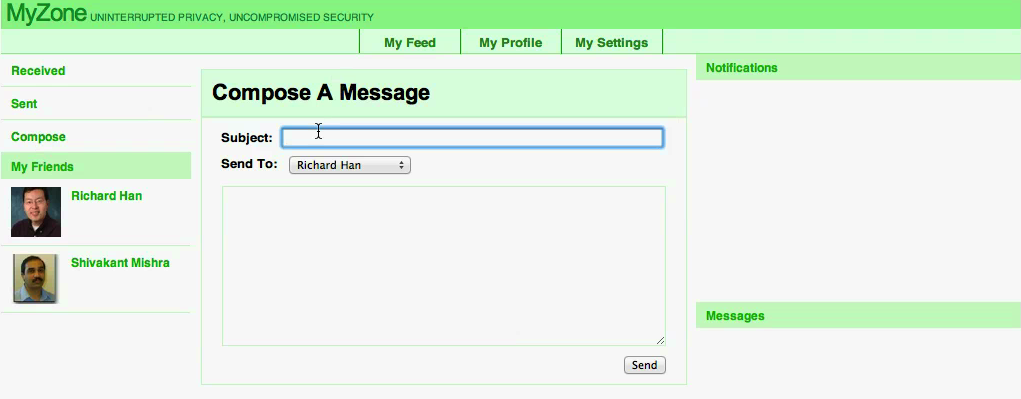 MyZone is a peer to peer social network that supports almost all features common in Facebook and Google+. In addition you can share unlimited mp3s and mp4s with your friends. MyZone does not downgrade the resolution of your photos and all established connections are encrypted using state of the art encryption techniques. MyZone is designed to be resilient towards cyber attacks especially DDoS attacks and government imposed censorships. MyZone should be an interesting social networking platform for users who are more concerned with the privacy of their profile information.