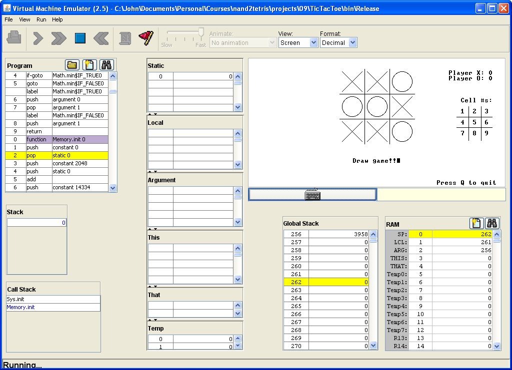 This is an implementation of the classic Tic Tac Toe game on the Hack computer as part of the Nand2Tetris project. The game features a 1 or 2-player mode with a computer-controlled player for single player games. The computer AI uses a 'minimax' algorithm and has 3 levels of difficulty - the Impossible mode is unbeatable!