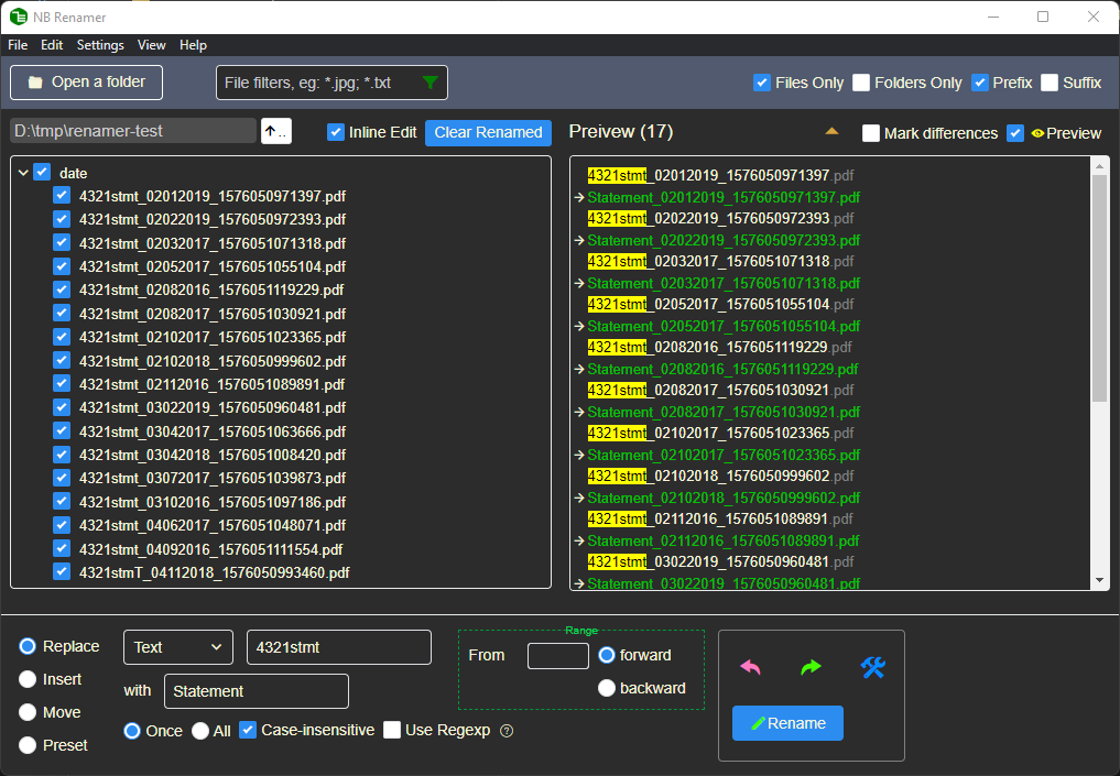 NB Renamer is a free bulk renaming tool. Compared to other batch renaming software, it has a dynamic and interactive interface. It shows the preview of file name changes, and populates parameter values when you click or select on the file names. Combining a succinct design with meticulous implementation, it strives to makes the whole batch renaming process easier and intuitive.