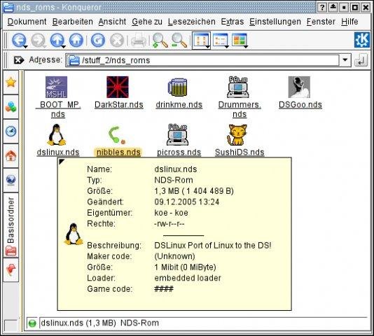 The NDS KFile Plugin allows to display meta data of Nintendo DS ROM files in the file tool tips and properties dialogs of the K Desktop Environment.