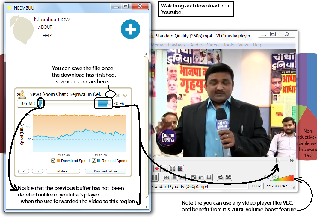 it does not only let you download videos, it also lets you play the video as you are watching it. If you forward the video to a point where no buffer exists, a new connection is created and also the old data is NOT deleted.