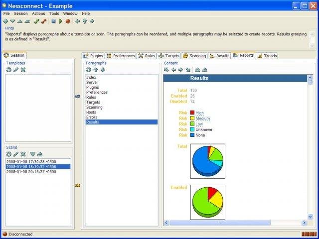 Nessconnect is a GUI, CLI and API client for Nessus and Nessus compatible servers. With an improved user interface, it provides local session management, scan templates, report generation through XSLT, charts and graphs, and vulnerability trending.