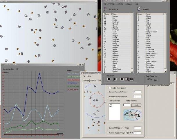 Example of using Neural networks to implement chase between mouses and cats. Mouses search for cheese on map, while cats are chasing mouses. Goal of the project is to see will both sides learn some new behavior over time using genetic algorithms.