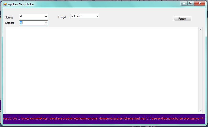 Proyek komponen ini merupakan proyek akhir salah satu matakuliah di Universitas Kristen Duta Wacana yaitu matakuliah pemrograman berbasis komponen yang diampu oleh Dosen Antonius Rachmat, S.Kom, M.Cs dan Yuan Lukito, S.Kom dimana komponen yang kami buat ini berguna menampilkan berita dari beberapa situs resmi berita di Indonesia melalui rss website masing, yang ditampilkan sebagai news ticker sehingga komponen ini bisa menanmpilkan berita dari gabungan situs-situs website berita .Bisa digunakan untuk aplikasi-aplikasi yang berbasiskan visual basic .net.