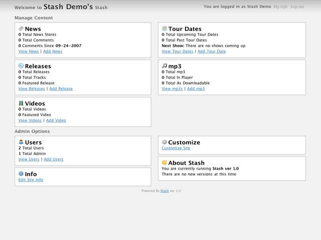 Every band deserves a back-end. With Stash you can mange your band's news, tour dates, discography, and more. Simple PHP based content management. Designed from the ground up as an easy way to update your bands website.
