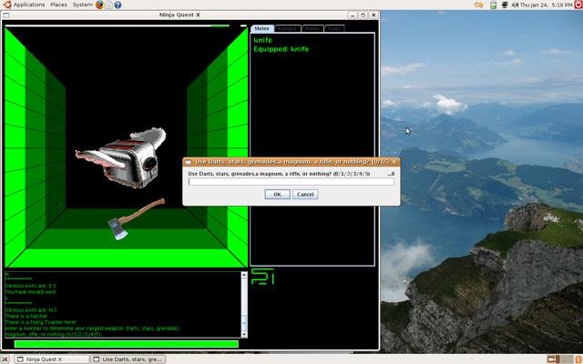 You play a ninja in a dungeon, exploring the many passages and fighting many fearsome monsters. Built to have the feel of a text adventure but with full graphics and a ninja-style look, NinjaQuestX is fairly simple, yet challenging and fun to play.